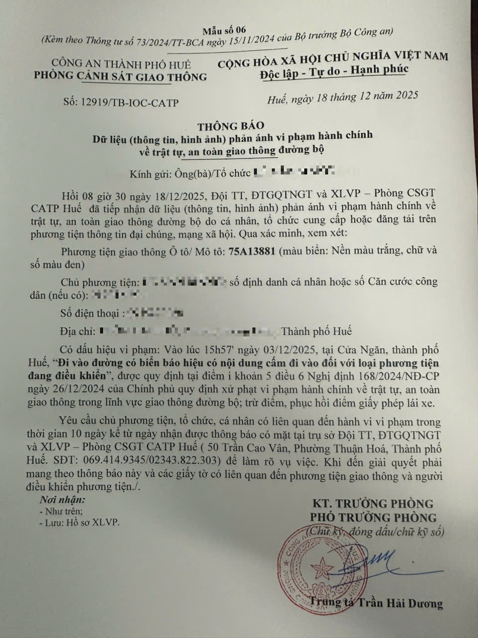 Qua hình ảnh phản ánh, Phòng Cảnh sát giao thông xác định lỗi vi phạm của người điều khiển phương tiện 75A13881 như sau: Đi vào đường có biển báo hiệu có nội dung cấm đi vào đối với loại phương tiện đang điều khiển, được quy định tại Điểm i khoản 5 Điều 6 Nghị định số 168/2024/NĐ-CP ngày 26/12/2024 của Chính phủ.
