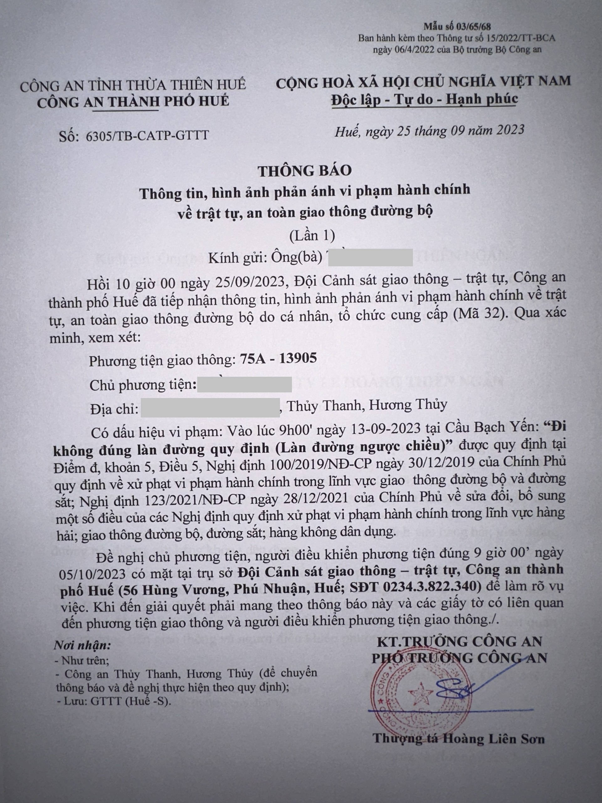 Qua quá trình xác minh làm việc với chủ phương tiện xác định lỗi vi phạm: Không chấp hành hiệu lệnh, chỉ dẫn của vạch kẻ đường (quy định tại điểm a, khoản 1, Điều 5 Nghị định 100/2019/NĐ-CP, sửa đổi, bổ sung tại Nghị định 123/2021/NĐ-CP).