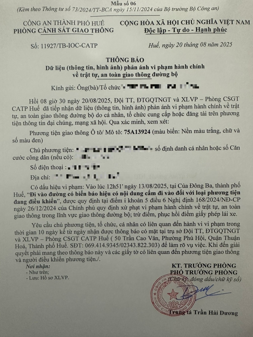 Qua hình ảnh phản ánh, Phòng Cảnh sát giao thông xác định lỗi vi phạm của người điều khiển phương tiện 75A13924 như sau: Đi vào đường có biển báo hiệu có nội dung cấm đi vào đối với loại phương tiện đang điều khiển, được quy định tại Điểm i khoản 5 Điều 6 Nghị định số 168/2024/NĐ-CP ngày 26/12/2024 của Chính phủ.