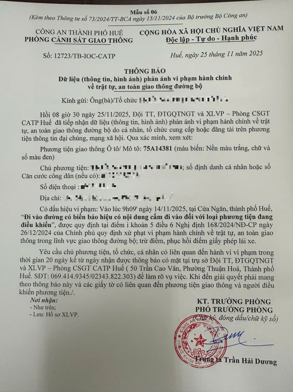 Qua hình ảnh phản ánh, Phòng Cảnh sát giao thông xác định lỗi vi phạm của người điều khiển phương tiện 75A14381 như sau: Đi vào đường có biển báo hiệu có nội dung cấm đi vào đối với loại phương tiện đang điều khiển, được quy định tại Điểm i khoản 5 Điều 6 Nghị định số 168/2024/NĐ-CP ngày 26/12/2024 của Chính phủ.