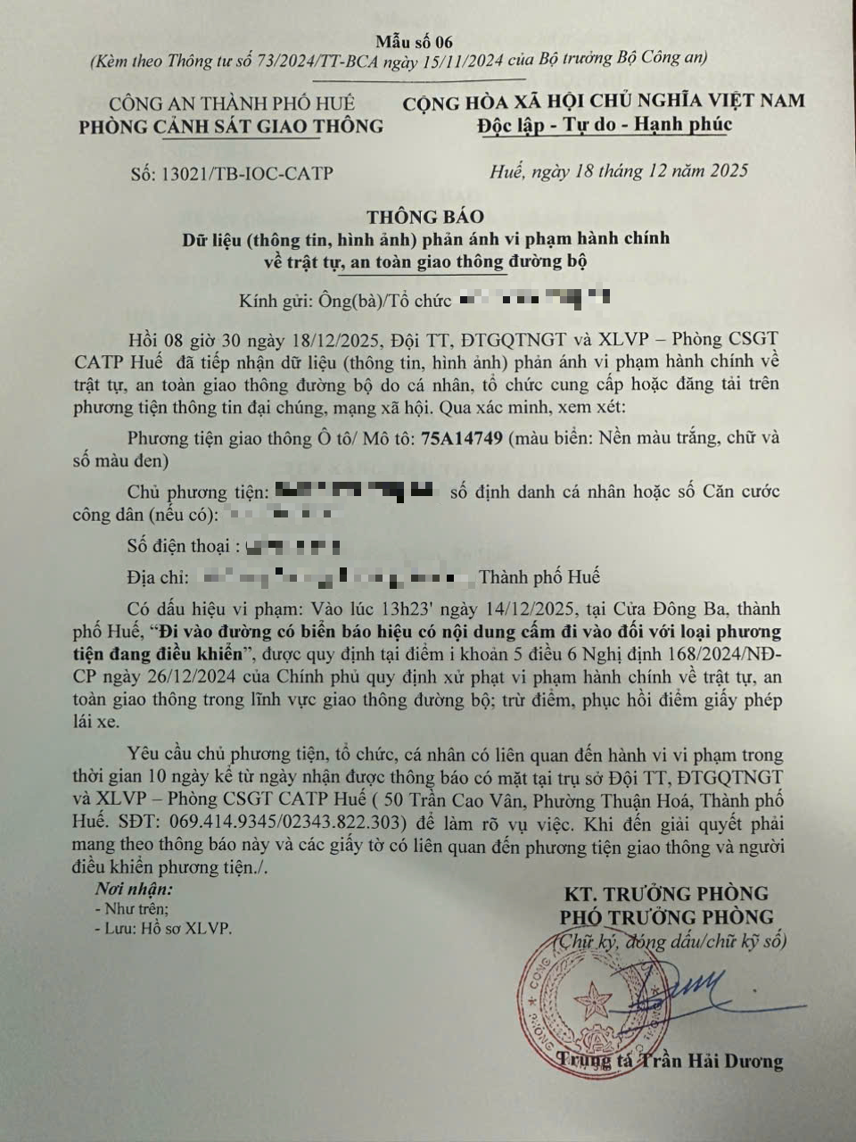 Qua hình ảnh phản ánh, Phòng Cảnh sát giao thông xác định lỗi vi phạm của người điều khiển phương tiện 75A14749 như sau: Đi vào đường có biển báo hiệu có nội dung cấm đi vào đối với loại phương tiện đang điều khiển, được quy định tại Điểm i khoản 5 Điều 6 Nghị định số 168/2024/NĐ-CP ngày 26/12/2024 của Chính phủ.