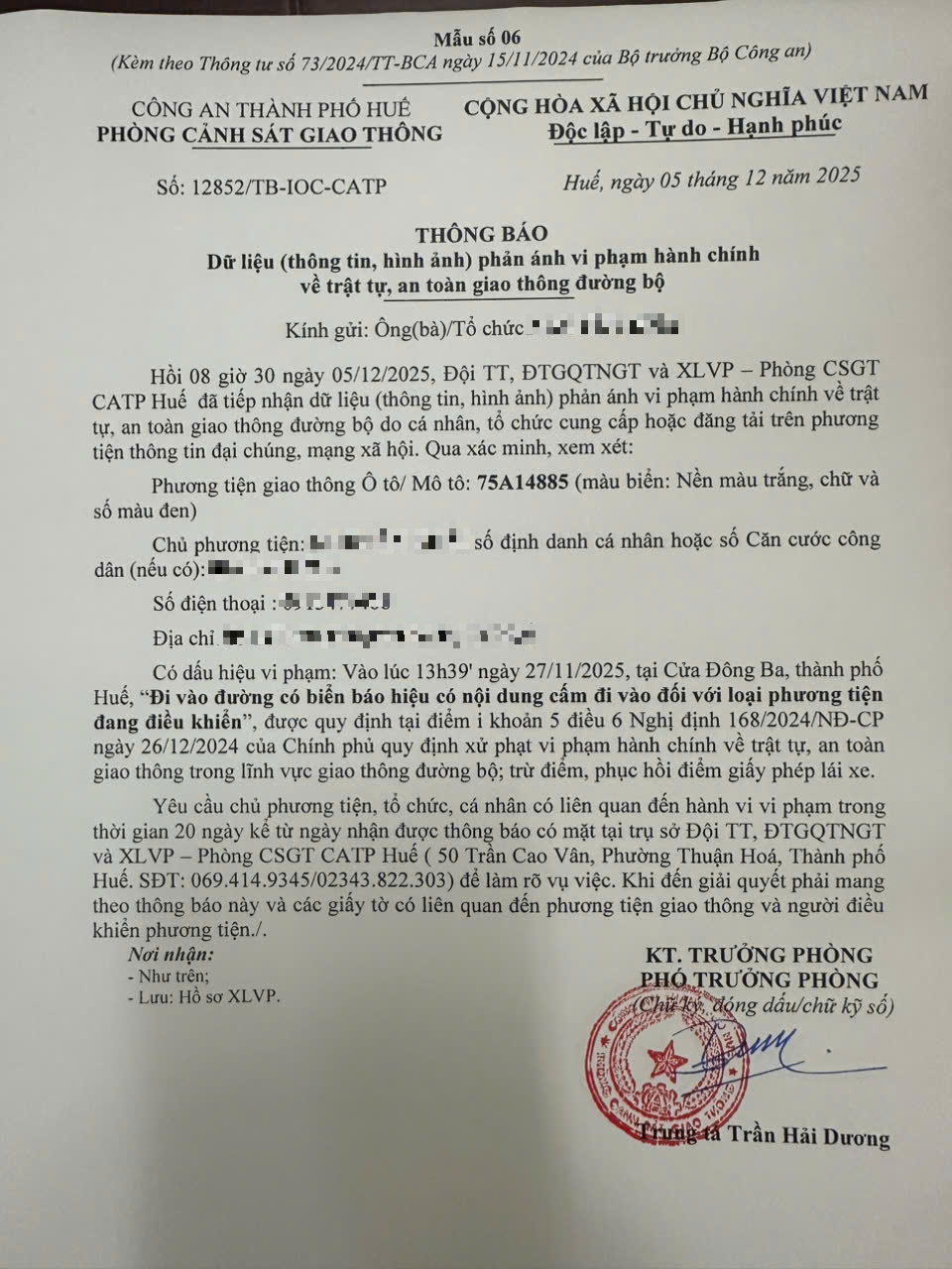 Qua hình ảnh phản ánh, Phòng Cảnh sát giao thông xác định lỗi vi phạm của người điều khiển phương tiện 75A14885 như sau: Đi vào đường có biển báo hiệu có nội dung cấm đi vào đối với loại phương tiện đang điều khiển, được quy định tại Điểm i khoản 5 Điều 6 Nghị định số 168/2024/NĐ-CP ngày 26/12/2024 của Chính phủ.