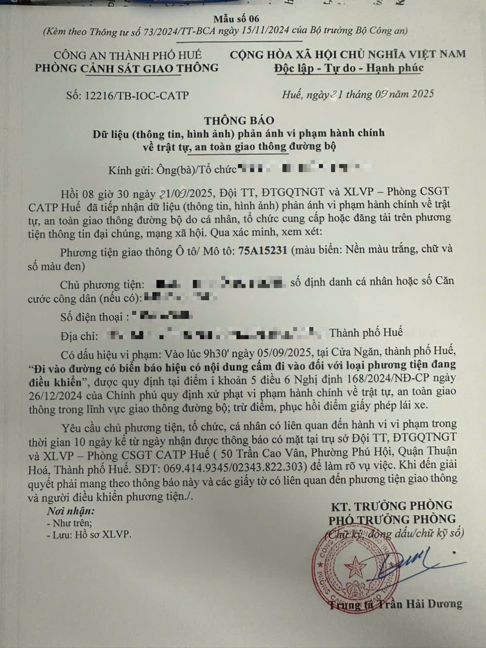 Vào lúc 09 giờ 30 phút, ngày 05/09/2025 ô tô mang biển kiểm soát 75A15231 đi vào đường cấm, giờ cấm khi tham gia giao thông tại Cửa Ngăn 1