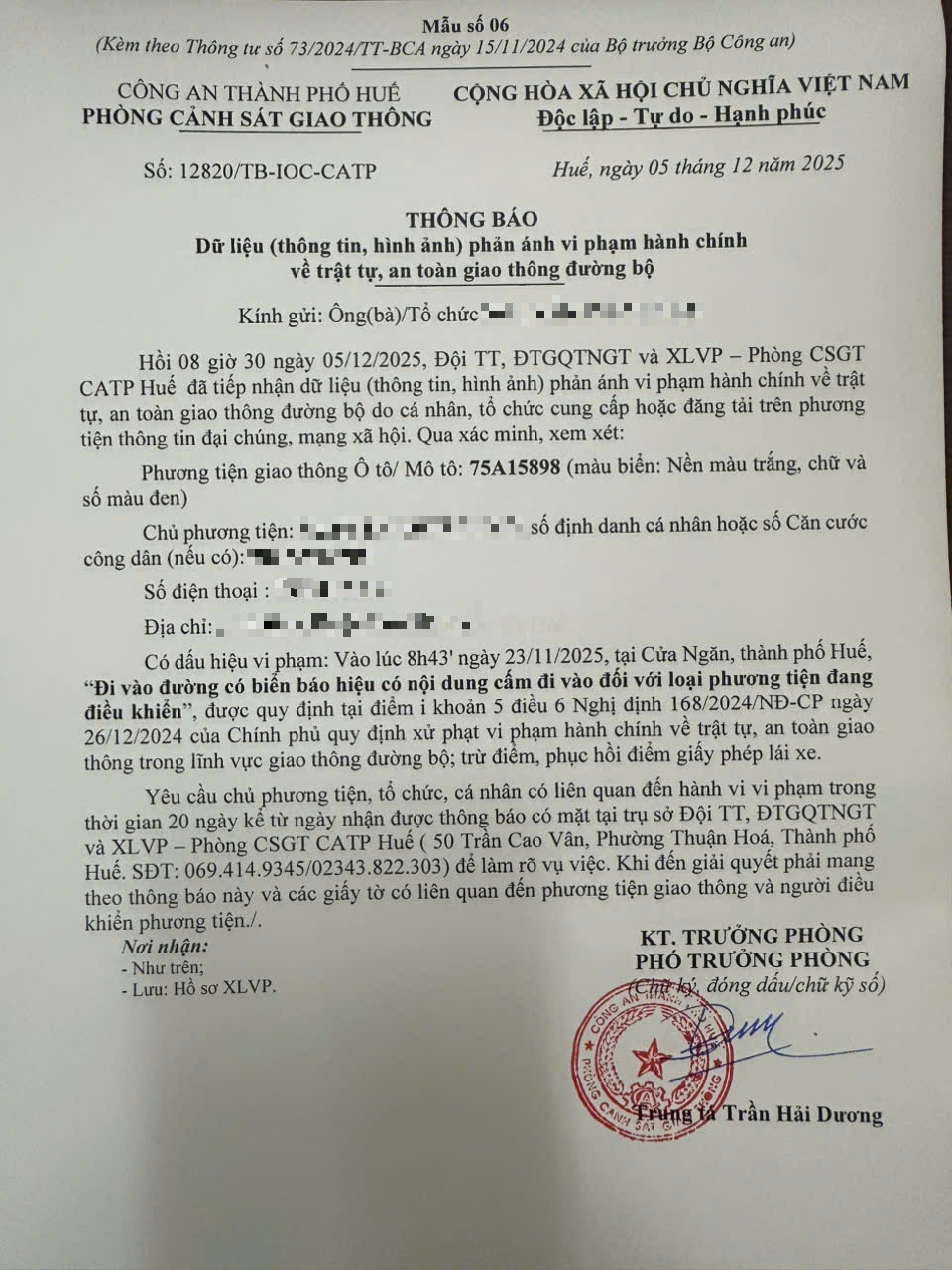 Qua hình ảnh phản ánh, Phòng Cảnh sát giao thông xác định lỗi vi phạm của người điều khiển phương tiện 75A15898 như sau: Đi vào đường có biển báo hiệu có nội dung cấm đi vào đối với loại phương tiện đang điều khiển, được quy định tại Điểm i khoản 5 Điều 6 Nghị định số 168/2024/NĐ-CP ngày 26/12/2024 của Chính phủ.