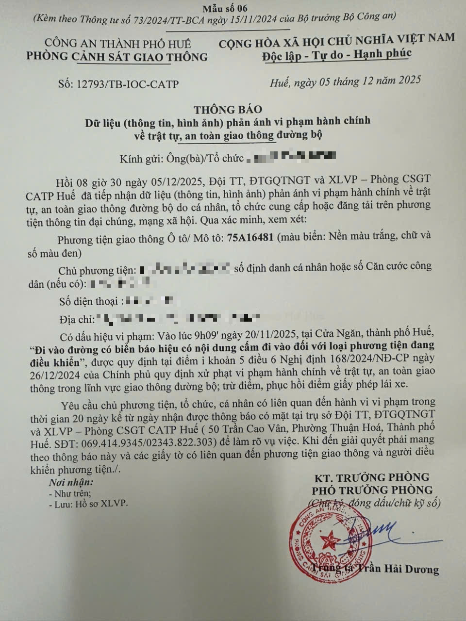Qua hình ảnh phản ánh, Phòng Cảnh sát giao thông xác định lỗi vi phạm của người điều khiển phương tiện 75A16481 như sau: Đi vào đường có biển báo hiệu có nội dung cấm đi vào đối với loại phương tiện đang điều khiển, được quy định tại Điểm i khoản 5 Điều 6 Nghị định số 168/2024/NĐ-CP ngày 26/12/2024 của Chính phủ.