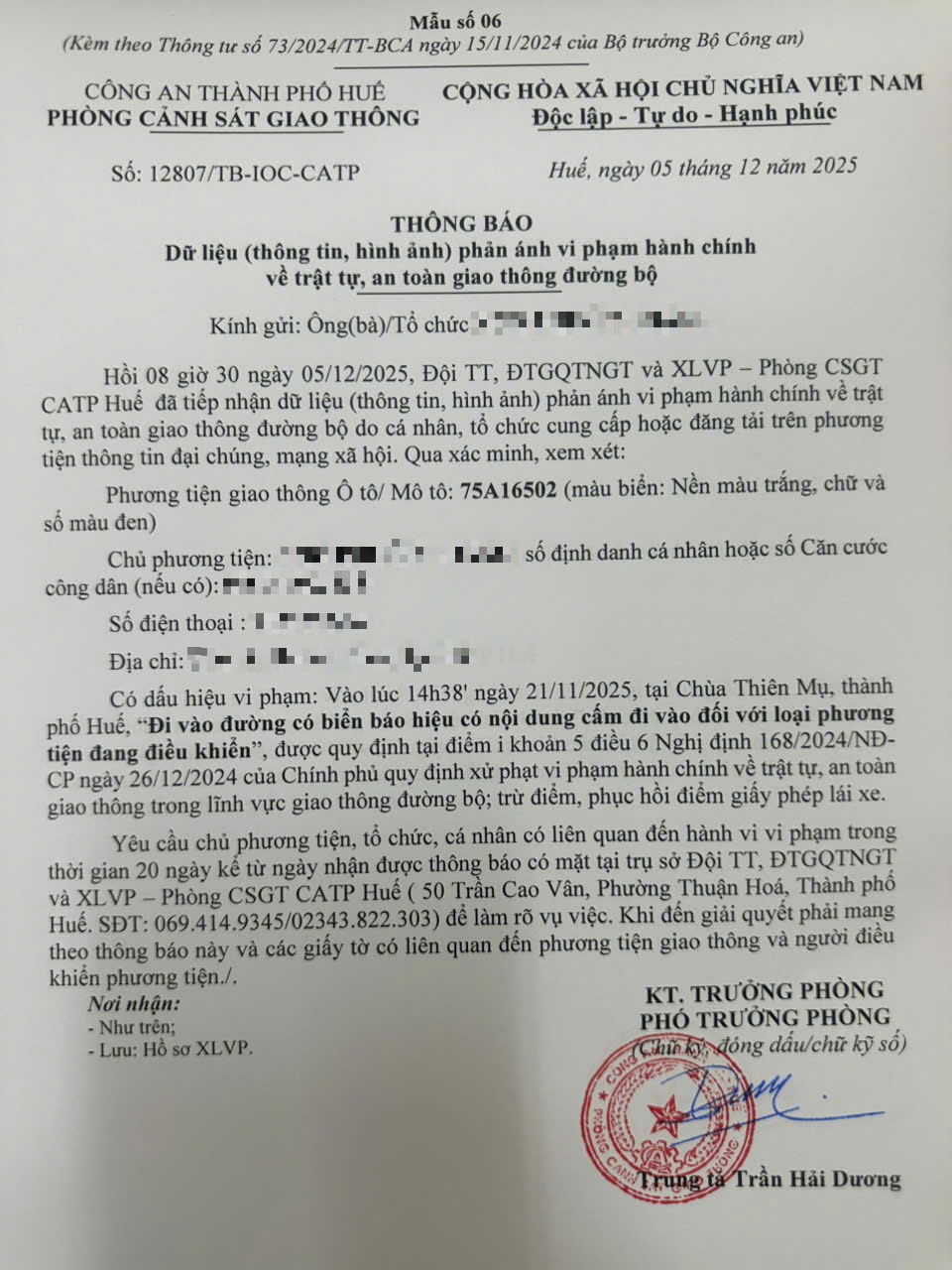 Qua hình ảnh phản ánh, Phòng Cảnh sát giao thông xác định lỗi vi phạm của người điều khiển phương tiện 75A16502 như sau: Đi vào đường có biển báo hiệu có nội dung cấm đi vào đối với loại phương tiện đang điều khiển, được quy định tại Điểm i khoản 5 Điều 6 Nghị định số 168/2024/NĐ-CP ngày 26/12/2024 của Chính phủ.
