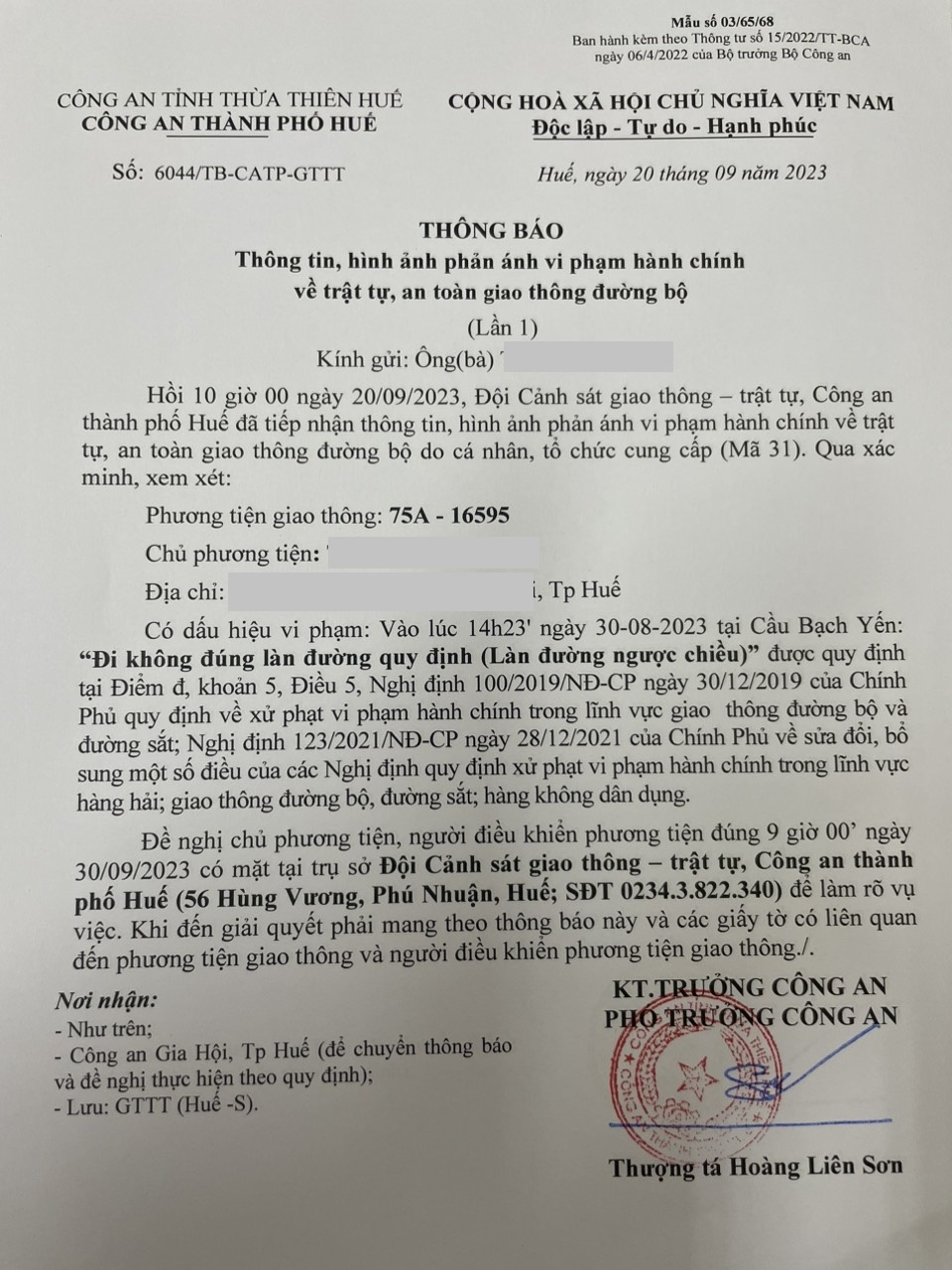 Công an thành phố cập nhật kết quả: Qua xác minh làm việc với chủ phương tiện vi phạm lỗi: Không chấp hành hiệu lệnh, chỉ dẫn của vạch kẻ đường, quy định tại điểm a, khoản 1, điều 5 Nghị định 100/2019/NĐ-CP được sửa đổi, bổ sung tại Nghị định 123/NĐ-CP ngày 28/12/2021. Ra Quyết định xử phạt 350.000đ. (Đính kèm Quyết định)
