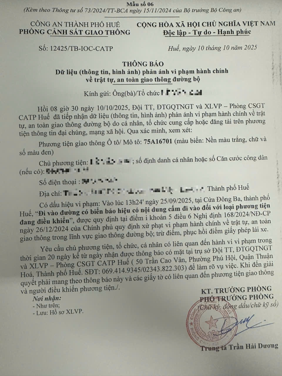 Vào lúc 13 giờ 24 phút, ngày 25/09/2025 ô tô mang biển kiểm soát 75A16701 đi vào đường cấm, giờ cấm khi tham gia giao thông tại Cửa Đông Ba (Out) (Hướng Mai Thúc Loan)