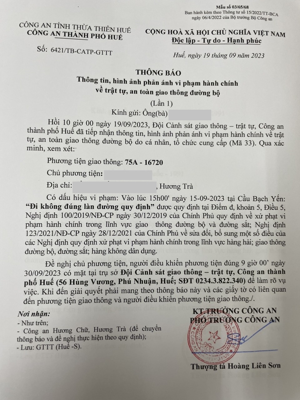 Qua xác minh làm việc với chủ phương tiện vi phạm lỗi: Không chấp hành hiệu lệnh, chỉ dẫn của vạch kẻ đường, quy định tại điểm a, khoản 1, điều 5 Nghị định 100/2019/NĐ-CP được sửa đổi, bổ sung tại Nghị định 123/NĐ-CP ngày 28/12/2021. Ra Quyết định xử phạt 350.000đ. (Đính kèm Quyết định)
