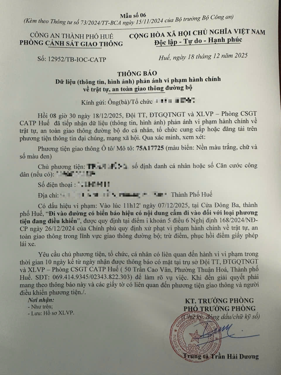 Qua hình ảnh phản ánh, Phòng Cảnh sát giao thông xác định lỗi vi phạm của người điều khiển phương tiện 75A17725 như sau: Đi vào đường có biển báo hiệu có nội dung cấm đi vào đối với loại phương tiện đang điều khiển, được quy định tại Điểm i khoản 5 Điều 6 Nghị định số 168/2024/NĐ-CP ngày 26/12/2024 của Chính phủ.