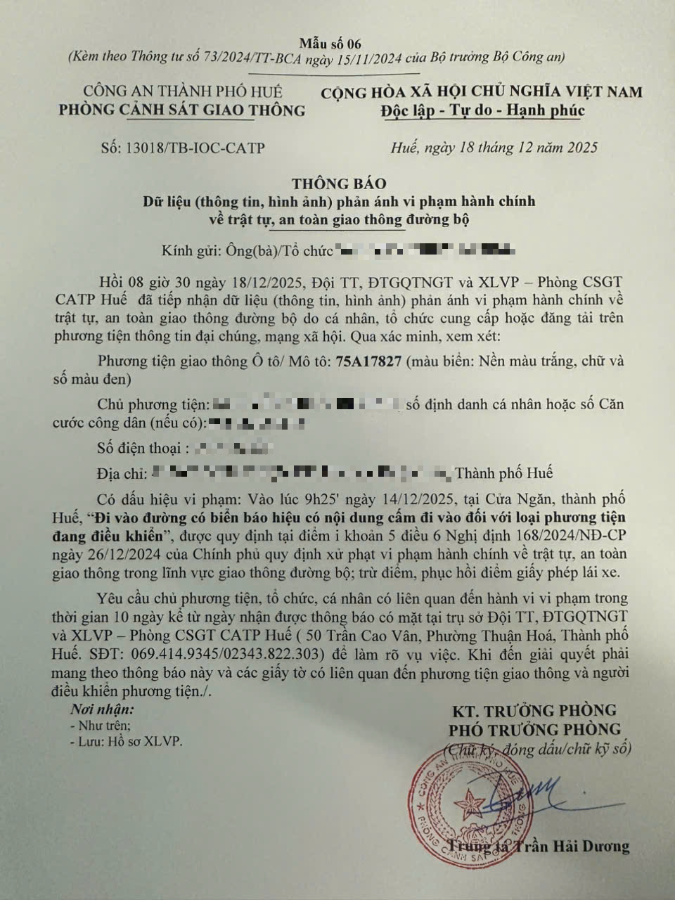 Qua hình ảnh phản ánh, Phòng Cảnh sát giao thông xác định lỗi vi phạm của người điều khiển phương tiện 75A17827 như sau: Đi vào đường có biển báo hiệu có nội dung cấm đi vào đối với loại phương tiện đang điều khiển, được quy định tại Điểm i khoản 5 Điều 6 Nghị định số 168/2024/NĐ-CP ngày 26/12/2024 của Chính phủ.