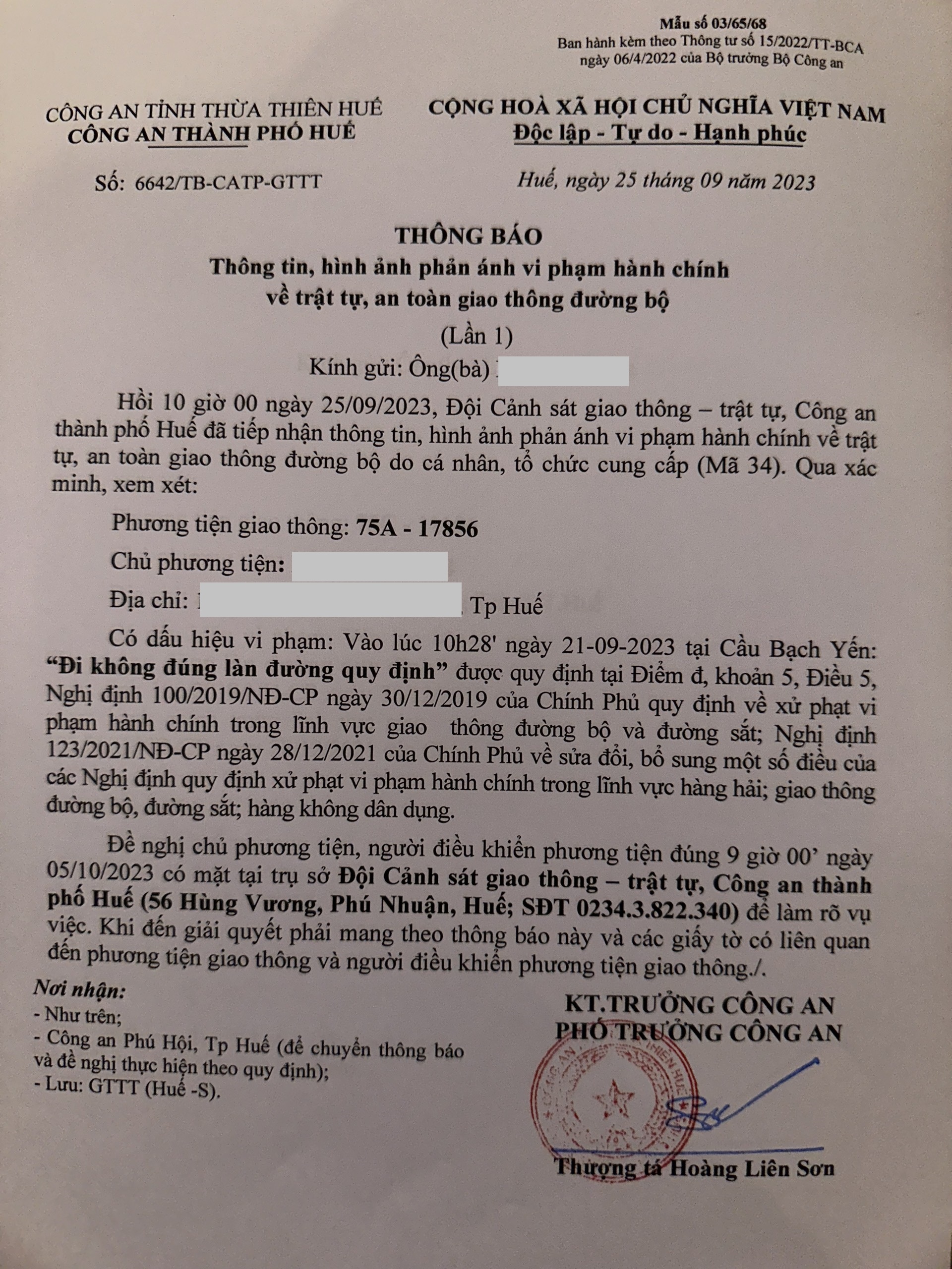 Công an thành phố cập nhật kết quả: Qua xác minh làm việc với chủ phương tiện vi phạm lỗi: Không chấp hành hiệu lệnh, chỉ dẫn của vạch kẻ đường, quy định tại điểm a, khoản 1, điều 5 Nghị định 100/2019/NĐ-CP được sửa đổi, bổ sung tại Nghị định 123/NĐ-CP ngày 28/12/2021. Ra Quyết định xử phạt 350.000đ. (Đính kèm Quyết định)