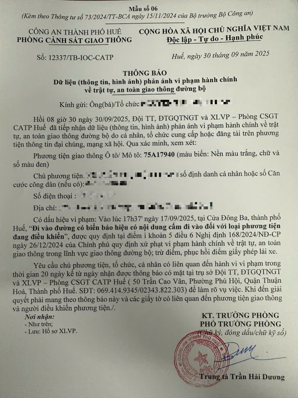 Qua hình ảnh phản ánh, Phòng Cảnh sát giao thông xác định lỗi vi phạm của người điều khiển phương tiện 75A17940 như sau: Đi vào đường có biển báo hiệu có nội dung cấm đi vào đối với loại phương tiện đang điều khiển, được quy định tại Điểm i khoản 5 Điều 6 Nghị định số 168/2024/NĐ-CP ngày 26/12/2024 của Chính phủ.