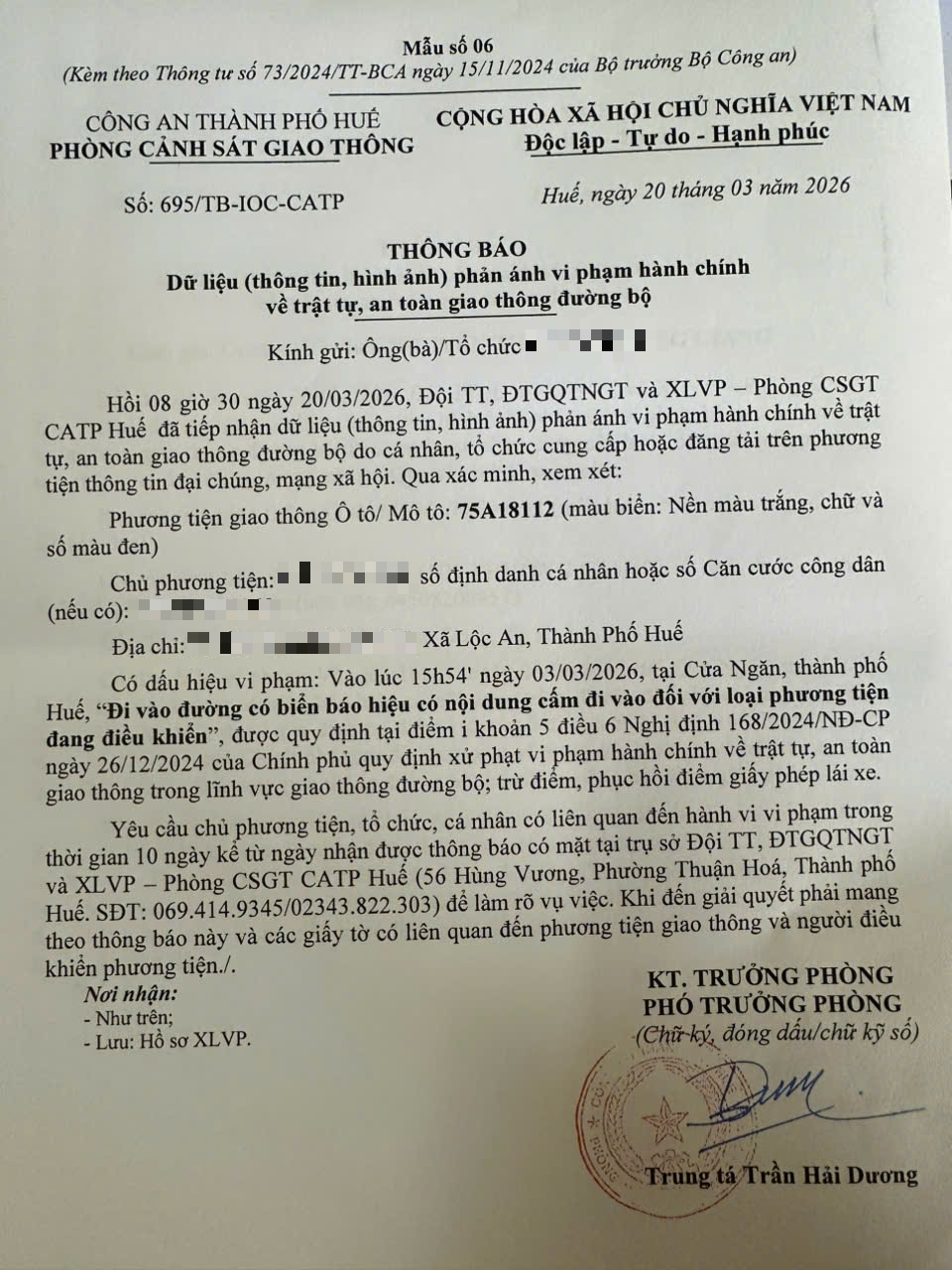 Qua hình ảnh phản ánh, Phòng Cảnh sát giao thông xác định lỗi vi phạm của người điều khiển phương tiện 75A18112 như sau: “Đi vào đường có biển báo hiệu có nội dung cấm đi vào đối với loại phương tiện đang điều khiển”, quy định tại điểm i, khoản 5, điều 6 Nghị định 168/2024/NĐ-CP.