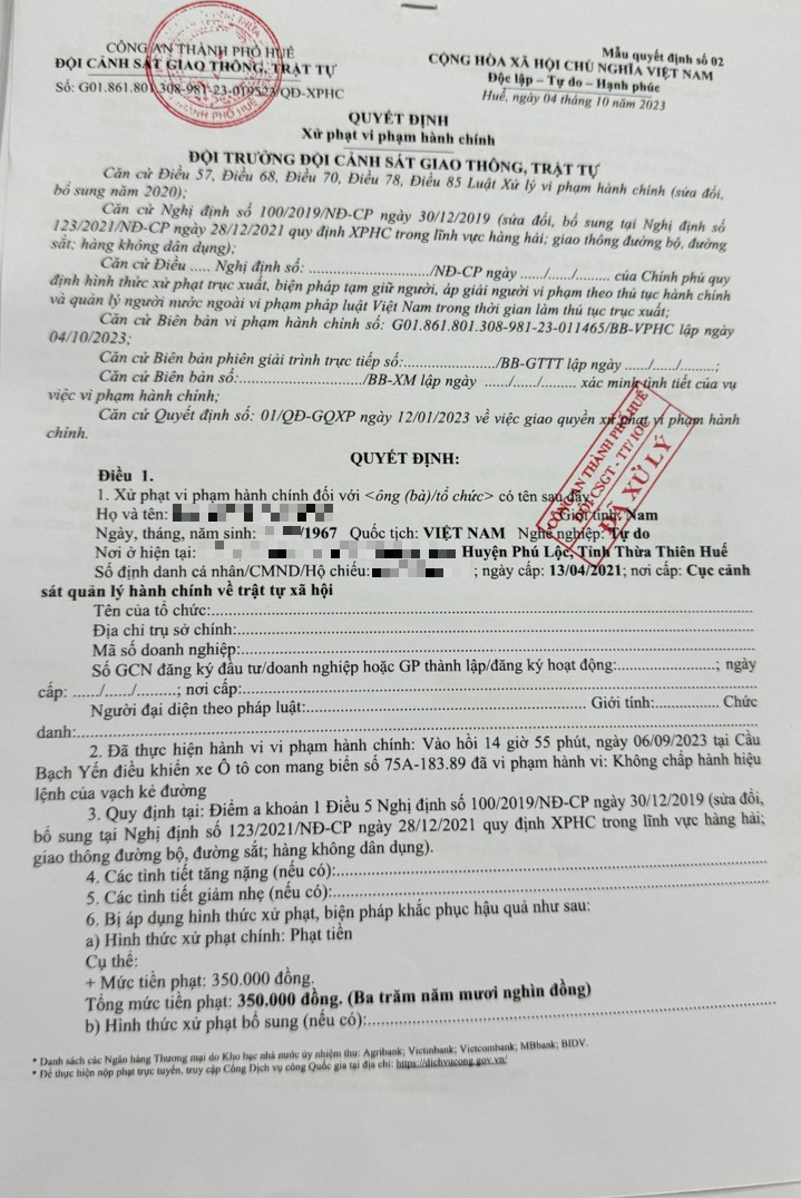 Công an thành phố Huế đã lập biên bản vi phạm hành chính và ra Quyết định xử phạt đối với chủ phương tiện phạt tiền 350.000đ. (Đính kèm Quyết định)