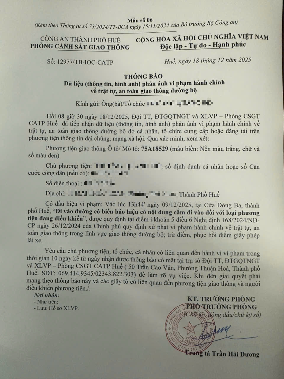 Qua hình ảnh phản ánh, Phòng Cảnh sát giao thông xác định lỗi vi phạm của người điều khiển phương tiện 75A18529 như sau: Đi vào đường có biển báo hiệu có nội dung cấm đi vào đối với loại phương tiện đang điều khiển, được quy định tại Điểm i khoản 5 Điều 6 Nghị định số 168/2024/NĐ-CP ngày 26/12/2024 của Chính phủ.
