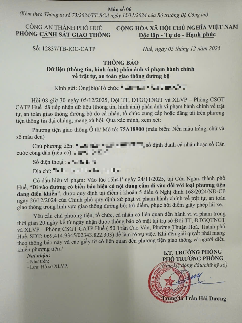 Qua hình ảnh phản ánh, Phòng Cảnh sát giao thông xác định lỗi vi phạm của người điều khiển phương tiện 75A18900 như sau: Đi vào đường có biển báo hiệu có nội dung cấm đi vào đối với loại phương tiện đang điều khiển, được quy định tại Điểm i khoản 5 Điều 6 Nghị định số 168/2024/NĐ-CP ngày 26/12/2024 của Chính phủ.