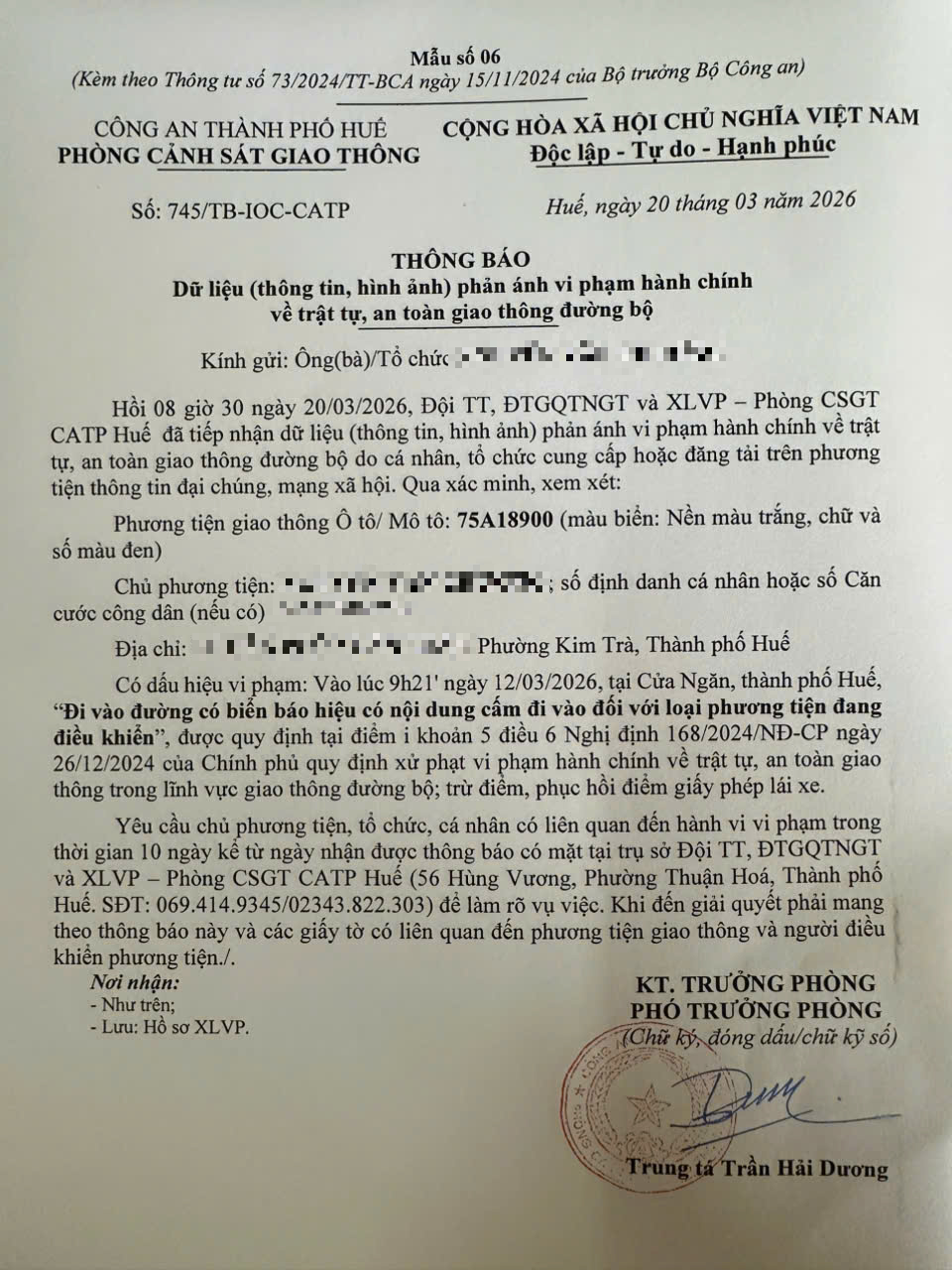 Vấn đề quý Ông/Bà phản ánh, Công an thành phố Huế đã chỉ đạo Phòng Cảnh sát giao thông kiểm tra và trả lời như sau: