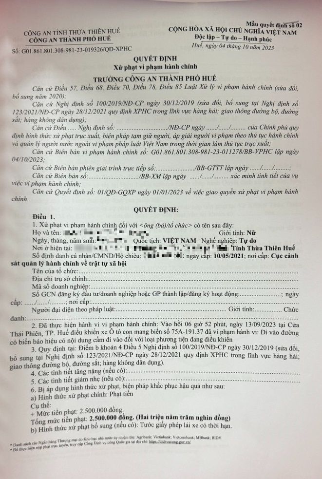 Công an thành phố đã ra Quyết định xử phạt 2.500.000 đồng, tước quyền sử dụng Giấy phép lái xe 02 tháng đối với người điều khiển phương tiện.