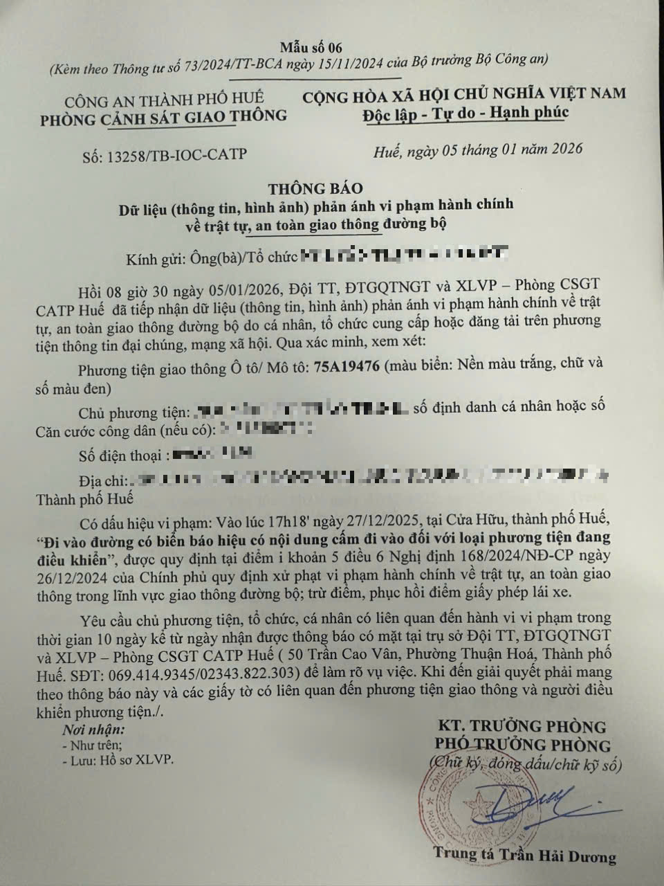 Qua hình ảnh phản ánh, Phòng Cảnh sát giao thông xác định lỗi vi phạm của người điều khiển phương tiện 75A19476 như sau: Đi vào đường có biển báo hiệu có nội dung cấm đi vào đối với loại phương tiện đang điều khiển, được quy định tại Điểm i khoản 5 Điều 6 Nghị định số 168/2024/NĐ-CP ngày 26/12/2024 của Chính phủ.