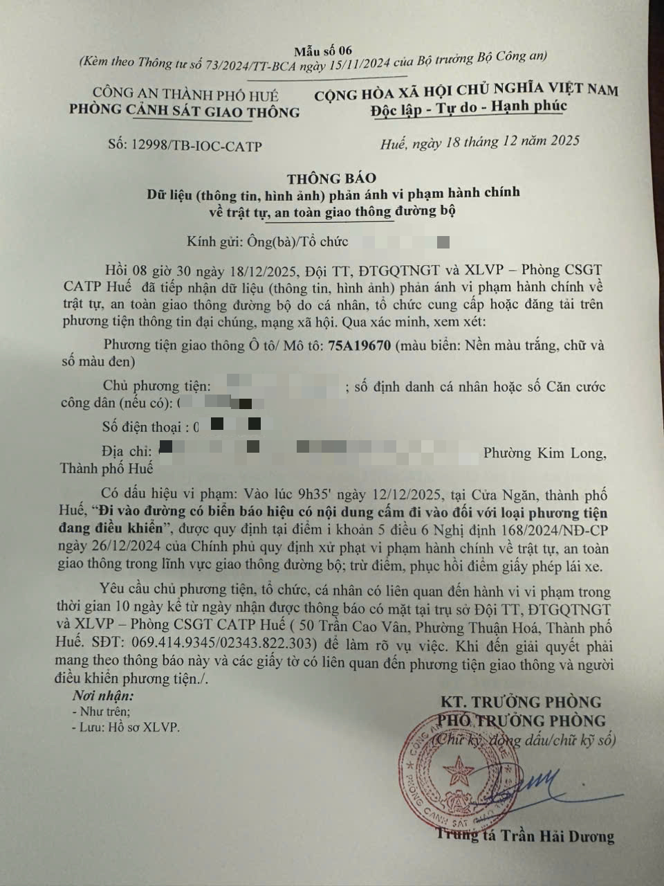Vấn đề quý Ông/Bà phản ánh, Phòng Cảnh sát giao thông – Công an thành phố Huế đã kiểm tra và xin thông báo kết quả như sau: