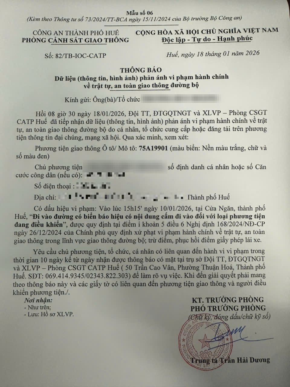 Qua hình ảnh phản ánh, Phòng Cảnh sát giao thông xác định lỗi vi phạm của người điều khiển phương tiện 75A19901 như sau: Đi vào đường có biển báo hiệu có nội dung cấm đi vào đối với loại phương tiện đang điều khiển, được quy định tại Điểm i khoản 5 Điều 6 Nghị định số 168/2024/NĐ-CP ngày 26/12/2024 của Chính phủ.