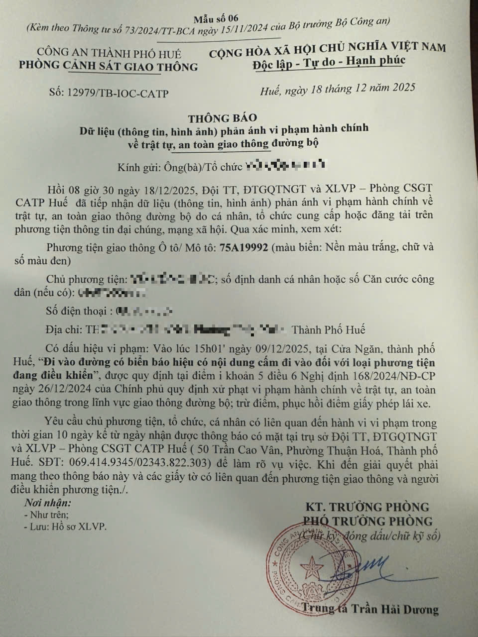 Qua hình ảnh phản ánh, Phòng Cảnh sát giao thông xác định lỗi vi phạm của người điều khiển phương 75A19992 tiện như sau: Đi vào đường có biển báo hiệu có nội dung cấm đi vào đối với loại phương tiện đang điều khiển, được quy định tại Điểm i khoản 5 Điều 6 Nghị định số 168/2024/NĐ-CP ngày 26/12/2024 của Chính phủ.