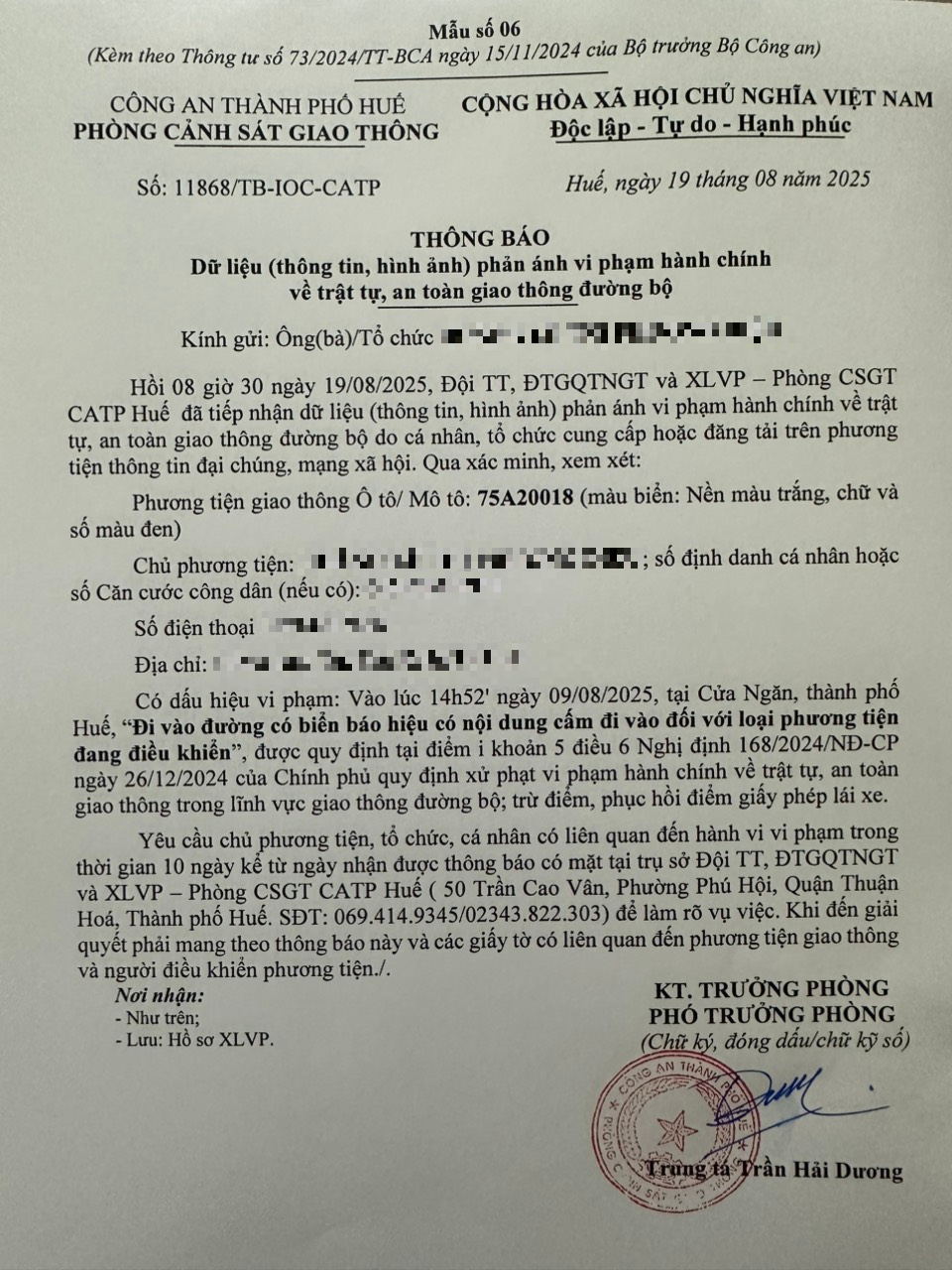 Qua hình ảnh phản ánh, Phòng Cảnh sát giao thông xác định lỗi vi phạm của người điều khiển phương tiện 75A20018 như sau: Đi vào đường có biển báo hiệu có nội dung cấm đi vào đối với loại phương tiện đang điều khiển, được quy định tại Điểm i khoản 5 Điều 6 Nghị định số 168/2024/NĐ-CP ngày 26/12/2024 của Chính phủ.