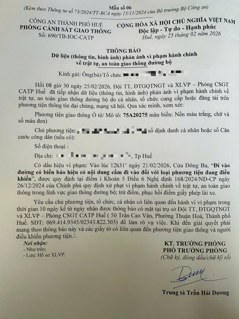 Qua hình ảnh phản ánh, Phòng Cảnh sát giao thông xác định lỗi vi phạm của người điều khiển phương tiện 75A20275 như sau: Đi vào đường có biển báo hiệu có nội dung cấm đi vào đối với loại phương tiện đang điều khiển, được quy định tại Điểm i khoản 5 Điều 6 Nghị định số 168/2024/NĐ-CP ngày 26/12/2024 của Chính phủ.