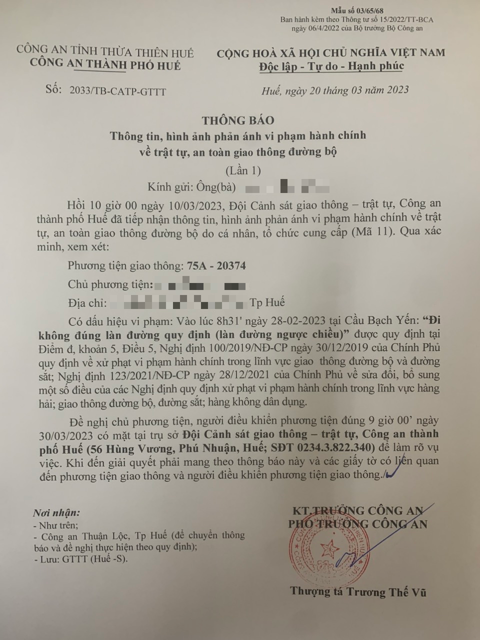 Vấn đề quý Ông/Bà phản ánh, Công an tỉnh đã chỉ đạo Công an thành phố Huế kiểm tra và xin thông báo kết quả xử lý như sau: