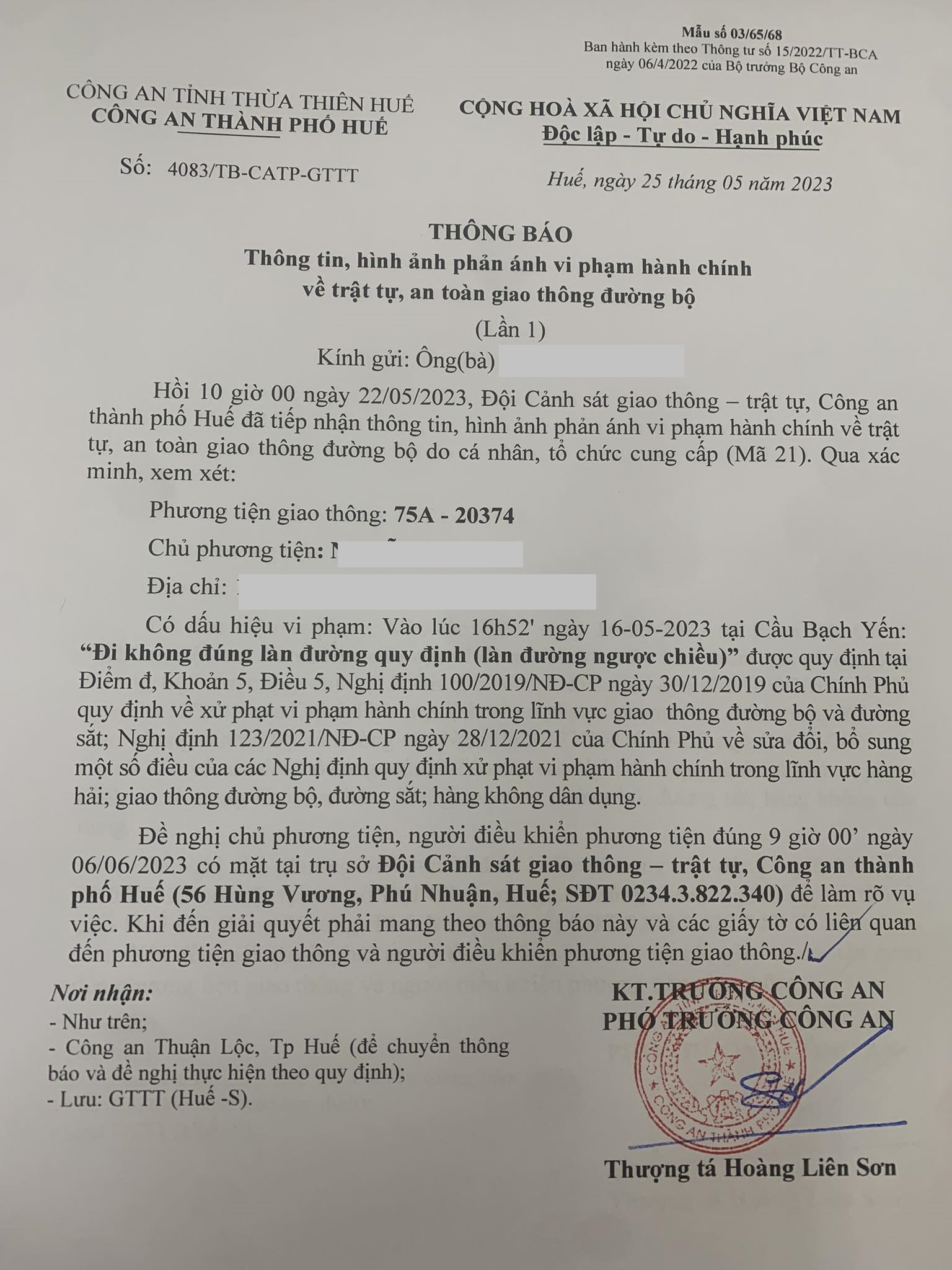 Vấn đề quý Ông/Bà phản ánh, Công an tỉnh đã chỉ đạo Công an thành phố Huế kiểm tra và xin thông báo kết quả xử lý như sau: