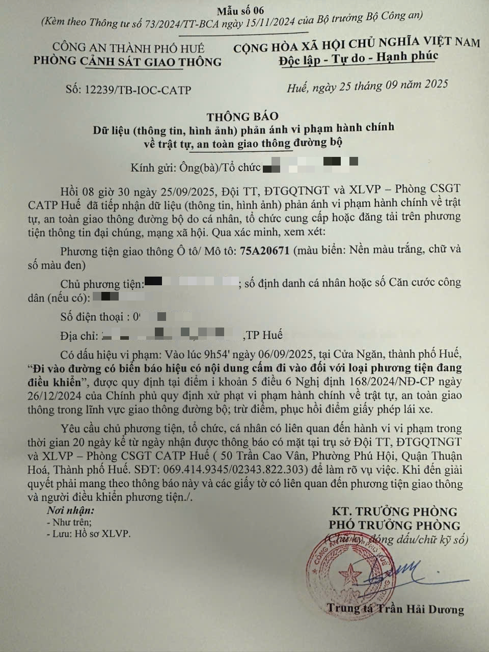 Qua hình ảnh phản ánh, Phòng Cảnh sát giao thông xác định lỗi vi phạm của người điều khiển phương tiện 75A20671 như sau: Đi vào đường có biển báo hiệu có nội dung cấm đi vào đối với loại phương tiện đang điều khiển, quy định tại điểm i, khoản 5, điều 6 Nghị định 168/2024/NĐ-CP.