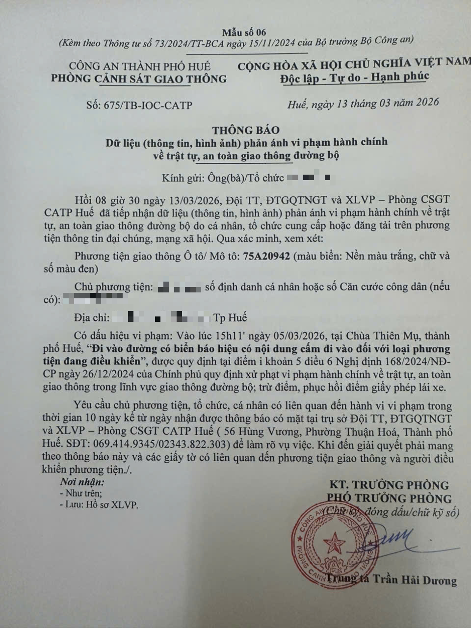 Qua hình ảnh phản ánh, Phòng Cảnh sát giao thông xác định lỗi vi phạm của người điều khiển phương tiện 75A20942 như sau: “Đi vào đường có biển báo hiệu có nội dung cấm đi vào đối với loại phương tiện đang điều khiển”, quy định tại điểm i, khoản 5, điều 6 Nghị định 168/2024/NĐ-CP.
