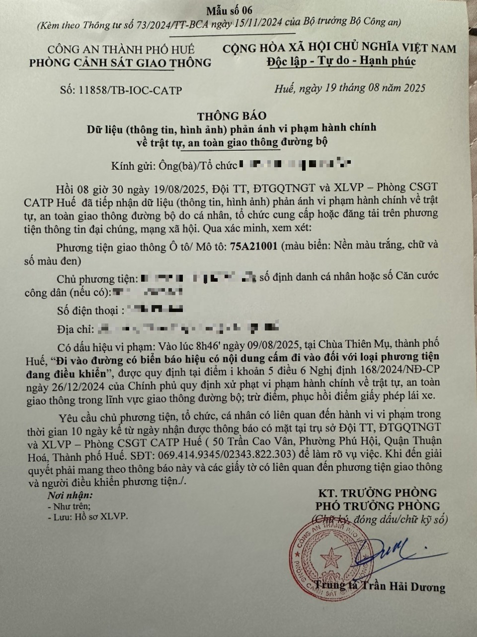 Qua hình ảnh phản ánh, Phòng Cảnh sát giao thông xác định lỗi vi phạm của người điều khiển phương tiện 75A21001 như sau: Đi vào đường có biển báo hiệu có nội dung cấm đi vào đối với loại phương tiện đang điều khiển, được quy định tại Điểm i khoản 5 Điều 6 Nghị định số 168/2024/NĐ-CP ngày 26/12/2024 của Chính phủ.