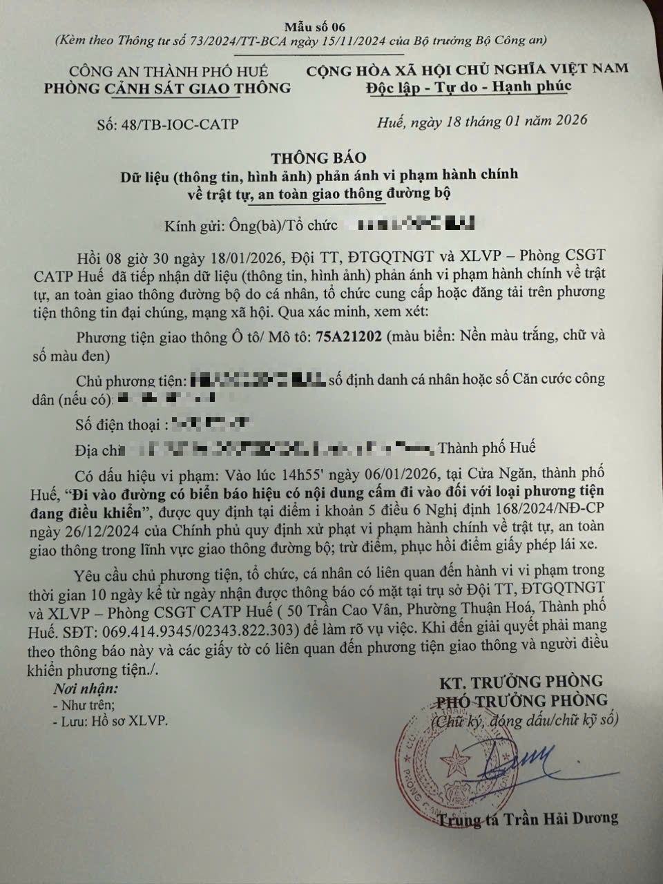 Qua hình ảnh phản ánh, Phòng Cảnh sát giao thông xác định lỗi vi phạm của người điều khiển phương tiện 75A21202 như sau: Đi vào đường có biển báo hiệu có nội dung cấm đi vào đối với loại phương tiện đang điều khiển, được quy định tại Điểm i khoản 5 Điều 6 Nghị định số 168/2024/NĐ-CP ngày 26/12/2024 của Chính phủ.