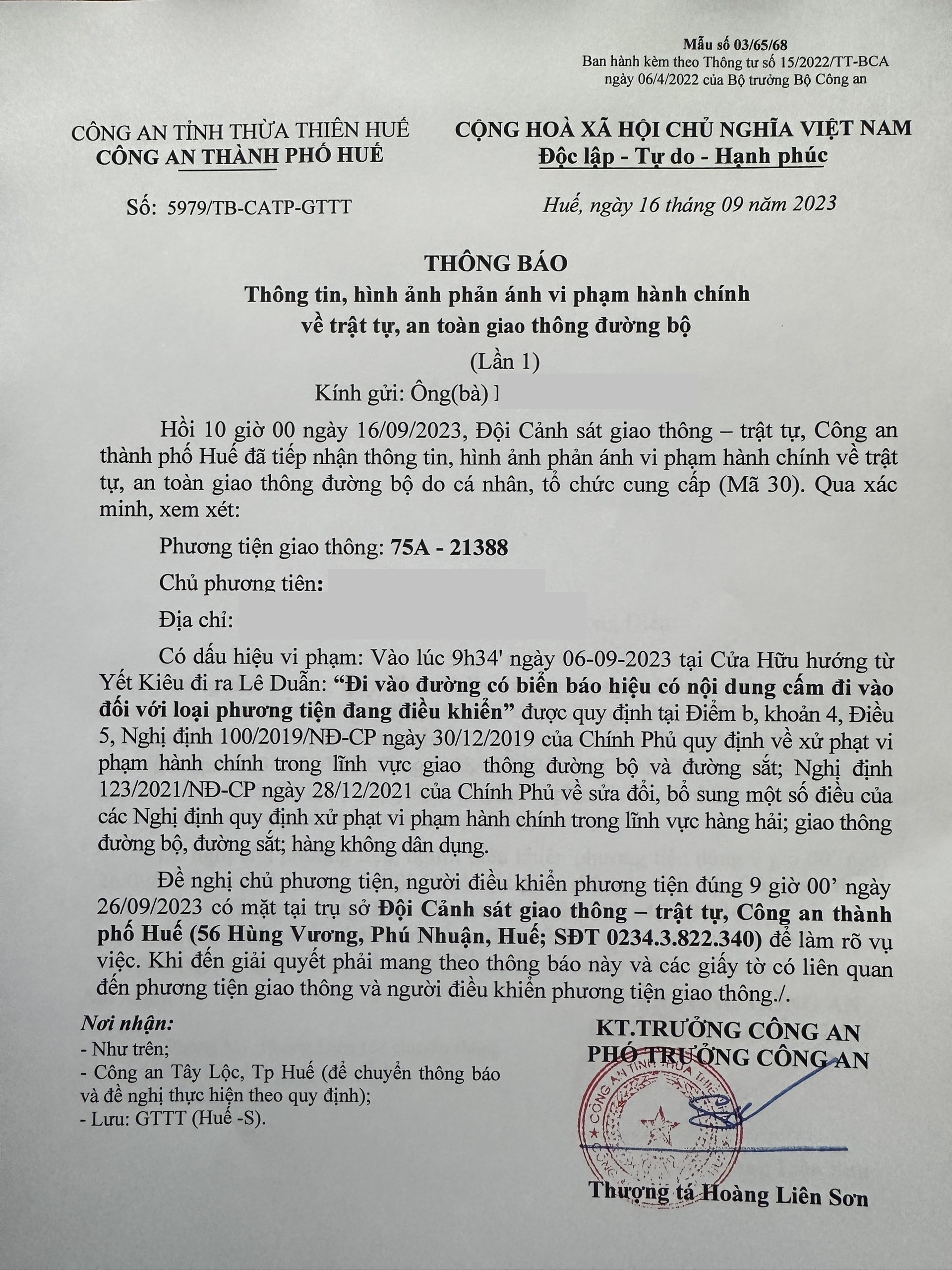 Vấn đề quý Ông/Bà phản ánh, Công an tỉnh đã chỉ đạo Công an thành phố Huế kiểm tra và xin thông báo kết quả như sau: