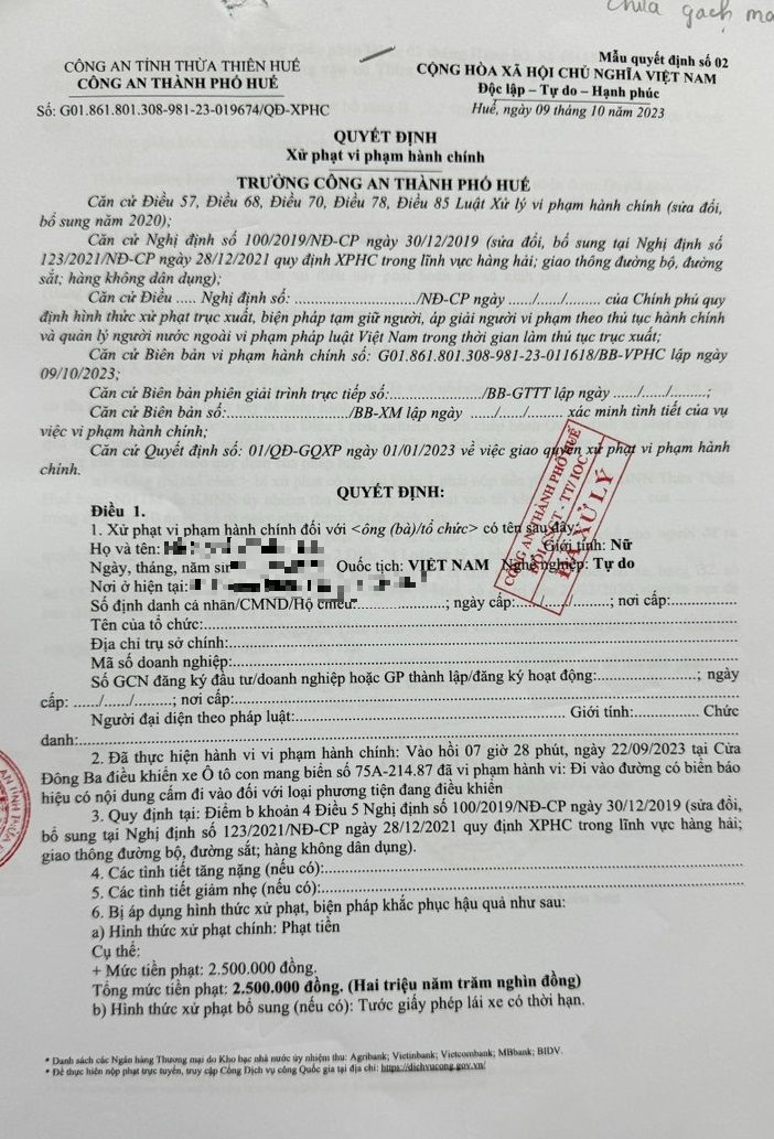 Công an thành phố đã ra Quyết định xử phạt 2.500.000 đồng, tước quyền sử dụng Giấy phép lái xe 02 tháng đối với người điều khiển phương tiện.