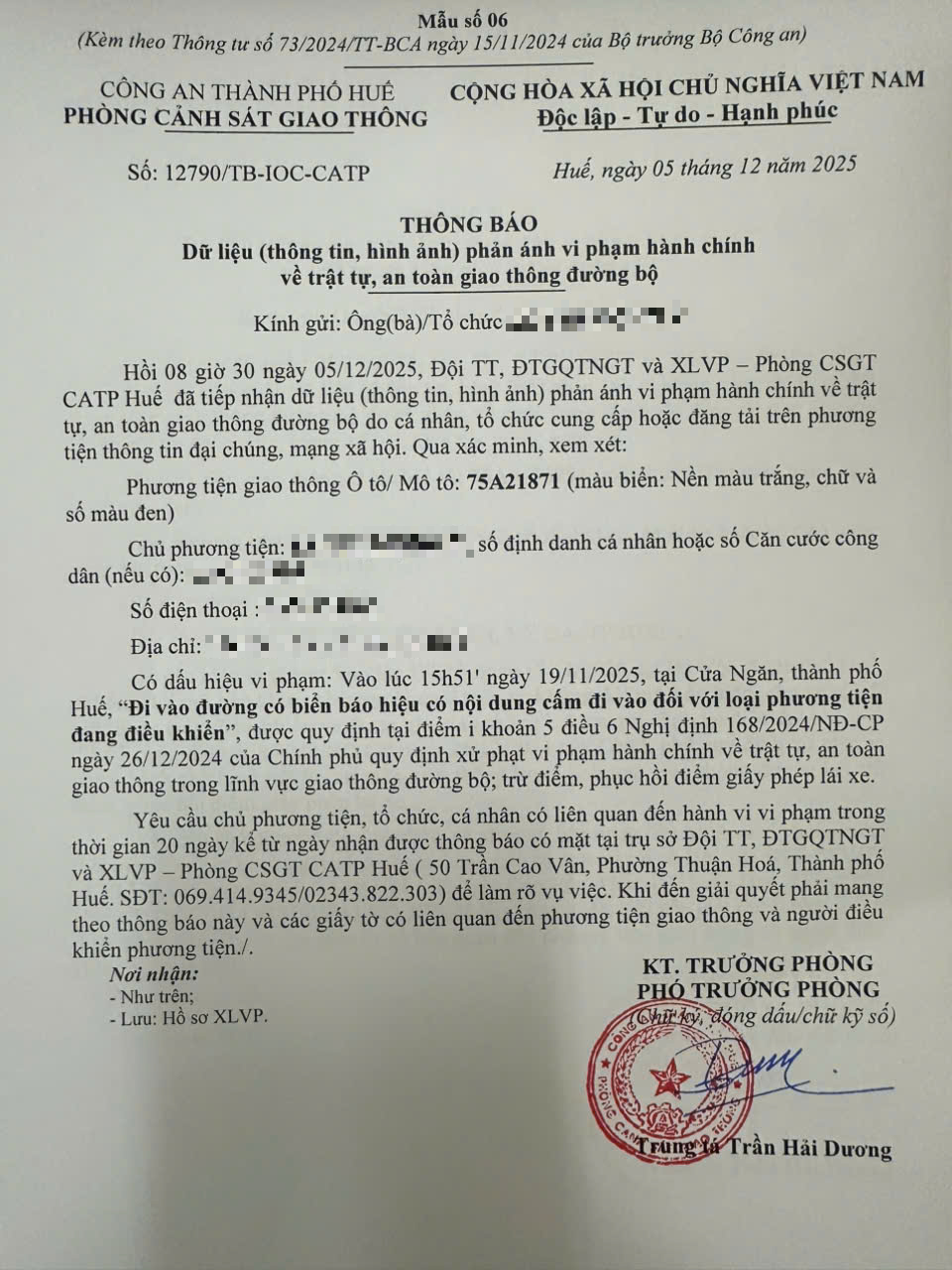 Qua hình ảnh phản ánh, Phòng Cảnh sát giao thông xác định lỗi vi phạm của người điều khiển phương tiện 75A21871 như sau: Đi vào đường có biển báo hiệu có nội dung cấm đi vào đối với loại phương tiện đang điều khiển, được quy định tại Điểm i khoản 5 Điều 6 Nghị định số 168/2024/NĐ-CP ngày 26/12/2024 của Chính phủ.