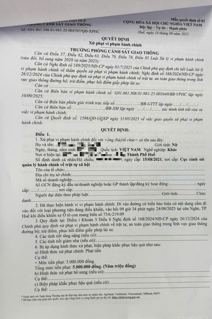 Phòng Cảnh sát giao thông đã xác minh, làm việc với chủ phương tiện 75A21909. Tại cơ quan, chủ phương tiện đã xem hình ảnh, công nhận vi phạm lỗi: Đi vào đường có biển báo hiệu có nội dung cấm đi vào đối với loại phương tiện đang điều khiển, quy định tại điểm i, khoản 5, điều 6 Nghị định số 168/2024/NĐ-CP ngày 26/12/2024 của Chính phủ, đồng thời cam kết không tái phạm.