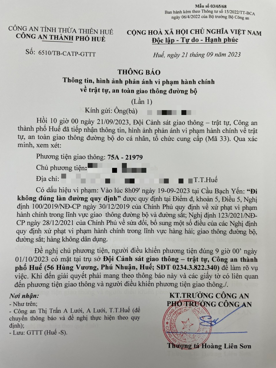 Công an thành phố cập nhật kết quả: Qua xác minh làm việc với chủ phương tiện vi phạm lỗi: Không chấp hành hiệu lệnh, chỉ dẫn của vạch kẻ đường, quy định tại điểm a, khoản 1, điều 5 Nghị định 100/2019/NĐ-CP được sửa đổi, bổ sung tại Nghị định 123/NĐ-CP ngày 28/12/2021. Ra Quyết định xử phạt 350.000đ. (Đính kèm Quyết định)