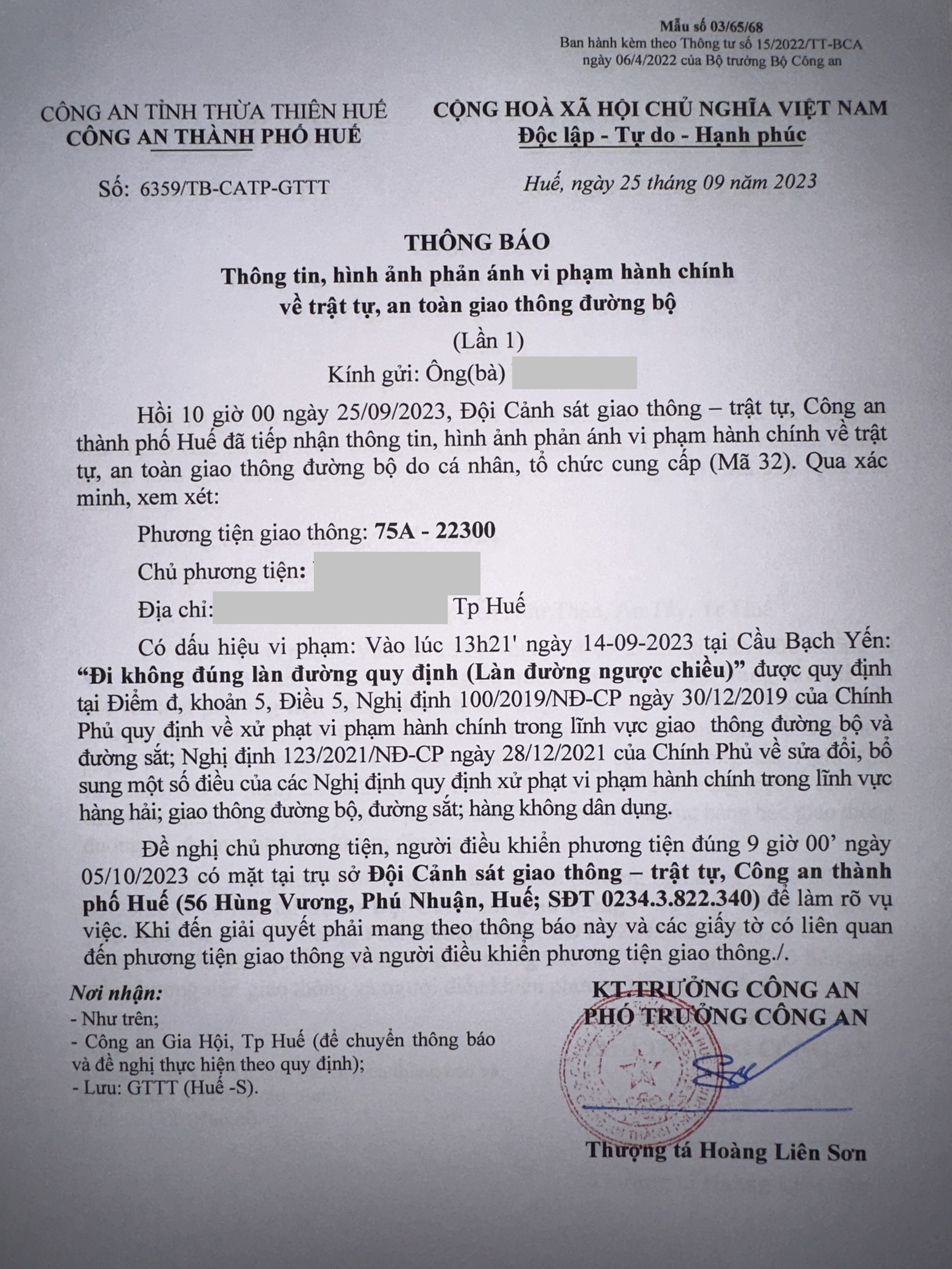 Công an thành phố cập nhật kết quả: Qua xác minh làm việc với chủ phương tiện vi phạm lỗi: Không chấp hành hiệu lệnh, chỉ dẫn của vạch kẻ đường, quy định tại điểm a, khoản 1, điều 5 Nghị định 100/2019/NĐ-CP được sửa đổi, bổ sung tại Nghị định 123/NĐ-CP ngày 28/12/2021. Ra Quyết định xử phạt 350.000đ. (Đính kèm Quyết định)