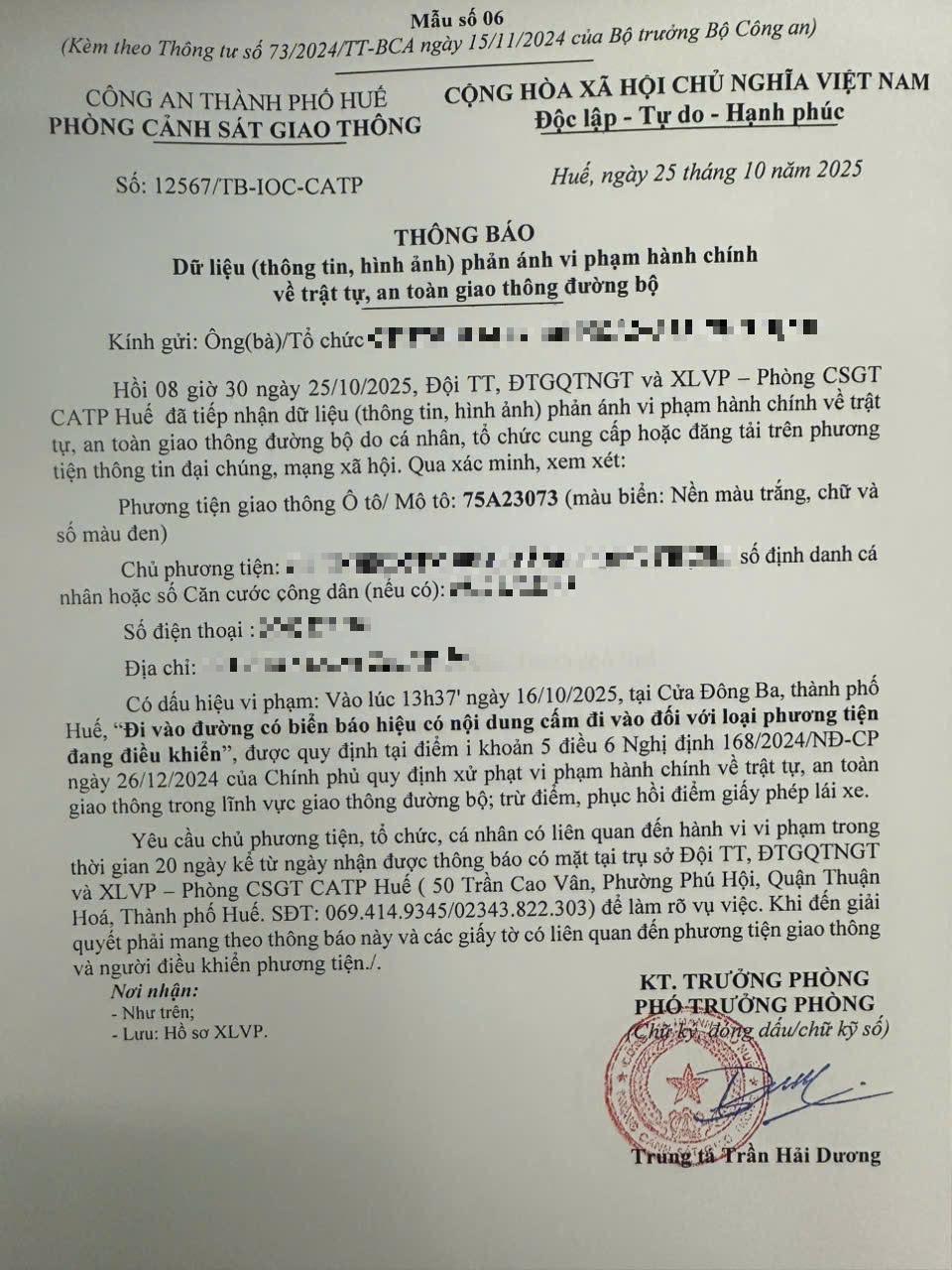Qua hình ảnh phản ánh, Phòng Cảnh sát giao thông xác định lỗi vi phạm của người điều khiển phương tiện 75A23073 như sau: Đi vào đường có biển báo hiệu có nội dung cấm đi vào đối với loại phương tiện đang điều khiển, được quy định tại Điểm i khoản 5 Điều 6 Nghị định số 168/2024/NĐ-CP ngày 26/12/2024 của Chính phủ.