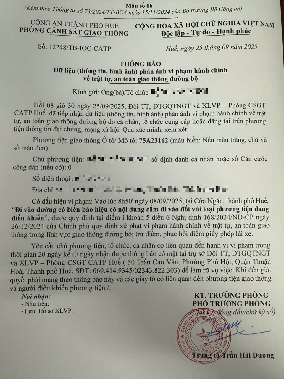 Qua hình ảnh phản ánh, Phòng Cảnh sát giao thông xác định lỗi vi phạm của người điều khiển phương tiện 75A23162 như sau: Đi vào đường có biển báo hiệu có nội dung cấm đi vào đối với loại phương tiện đang điều khiển, được quy định tại Điểm i khoản 5 Điều 6 Nghị định số 168/2024/NĐ-CP ngày 26/12/2024 của Chính phủ.