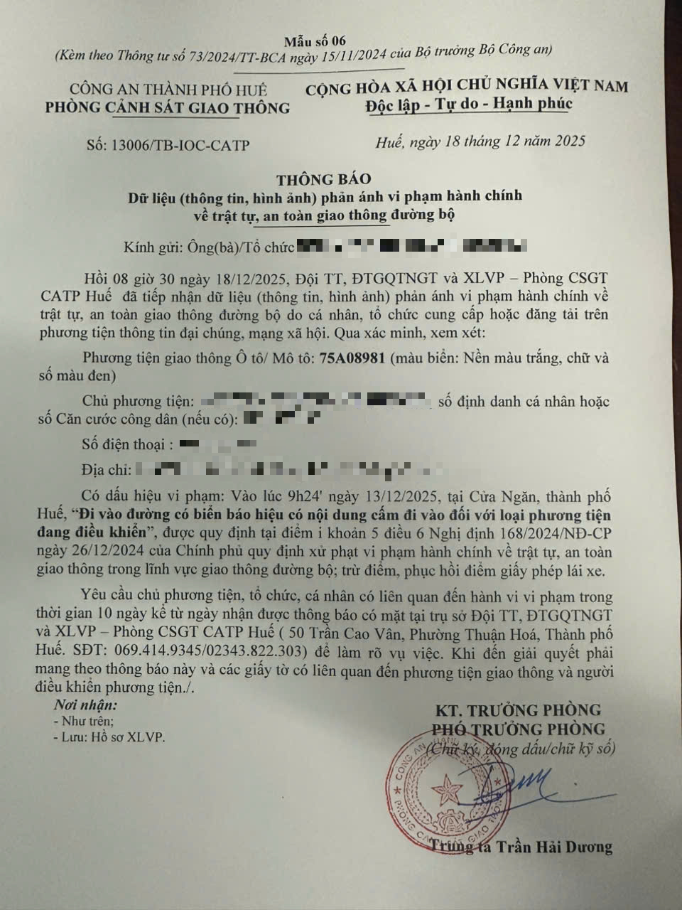 Qua hình ảnh phản ánh, Phòng Cảnh sát giao thông xác định lỗi vi phạm của người điều khiển phương tiện 75A23677 như sau: Đi vào đường có biển báo hiệu có nội dung cấm đi vào đối với loại phương tiện đang điều khiển, được quy định tại Điểm i khoản 5 Điều 6 Nghị định số 168/2024/NĐ-CP ngày 26/12/2024 của Chính phủ.