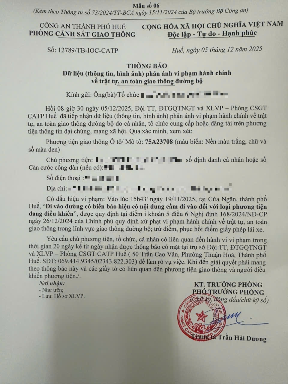 Qua hình ảnh phản ánh, Phòng Cảnh sát giao thông xác định lỗi vi phạm của người điều khiển phương tiện 75A23708 như sau: Đi vào đường có biển báo hiệu có nội dung cấm đi vào đối với loại phương tiện đang điều khiển, được quy định tại Điểm i khoản 5 Điều 6 Nghị định số 168/2024/NĐ-CP ngày 26/12/2024 của Chính phủ.
