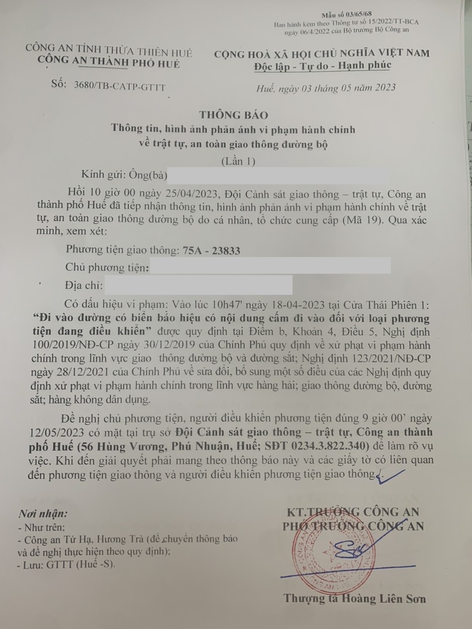Vấn đề quý Ông/Bà phản ánh, Công an tỉnh đã chỉ đạo Công an thành phố Huế kiểm tra và xin thông báo kết quả xử lý như sau: