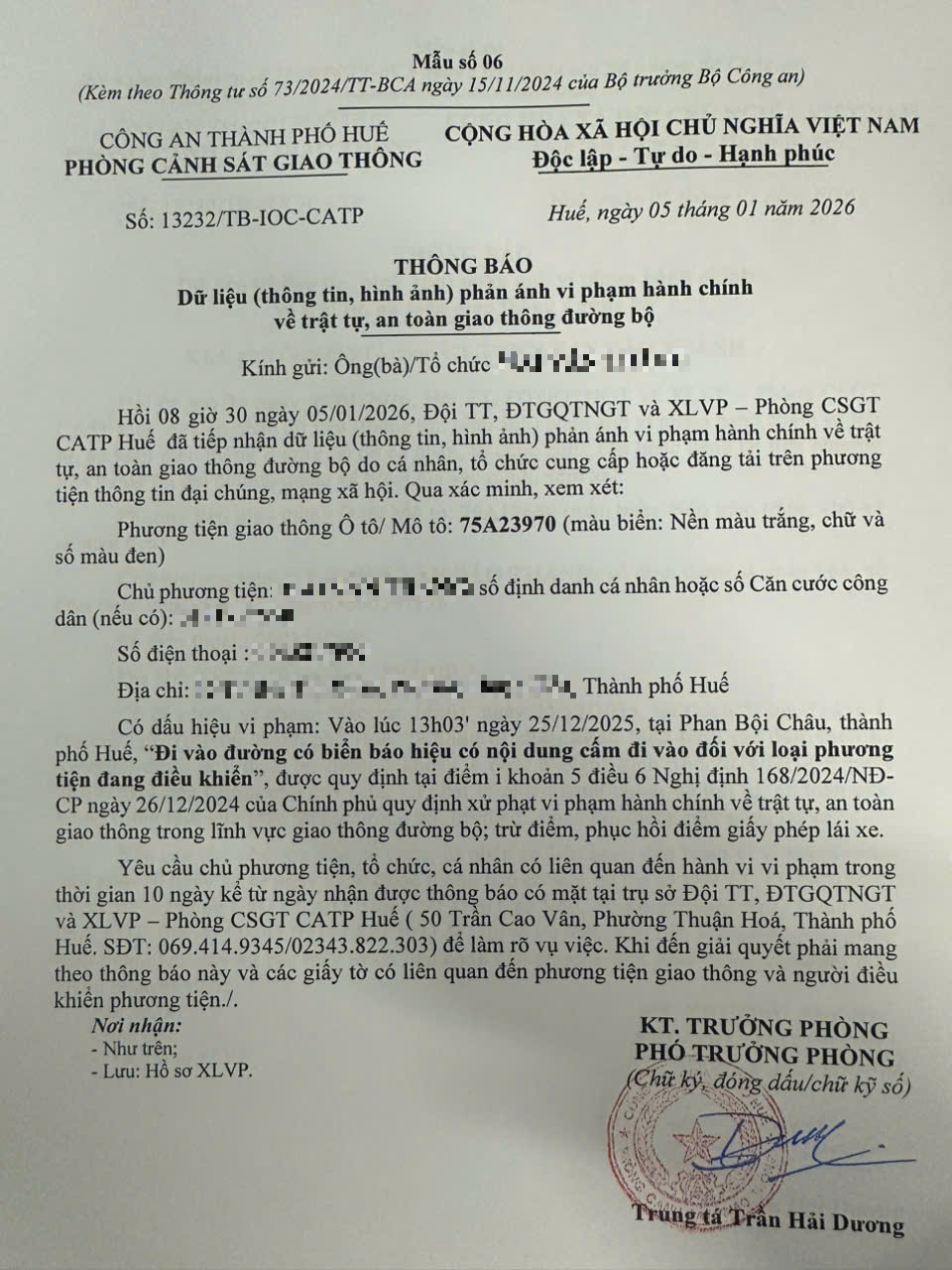 Qua hình ảnh phản ánh, Phòng Cảnh sát giao thông xác định lỗi vi phạm của người điều khiển phương tiện 75A23970 như sau: Đi vào đường có biển báo hiệu có nội dung cấm đi vào đối với loại phương tiện đang điều khiển, được quy định tại Điểm i khoản 5 Điều 6 Nghị định số 168/2024/NĐ-CP ngày 26/12/2024 của Chính phủ.
