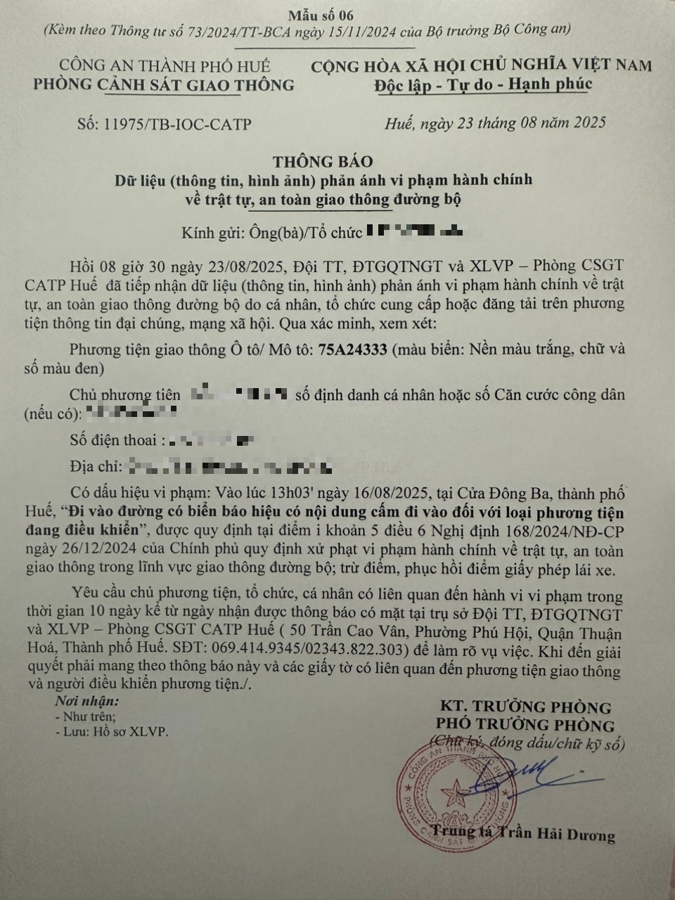 Qua hình ảnh phản ánh, Phòng Cảnh sát giao thông xác định lỗi vi phạm của người điều khiển phương tiện 75A24333 như sau: Đi vào đường có biển báo hiệu có nội dung cấm đi vào đối với loại phương tiện đang điều khiển, được quy định tại Điểm i khoản 5 Điều 6 Nghị định số 168/2024/NĐ-CP ngày 26/12/2024 của Chính phủ.
