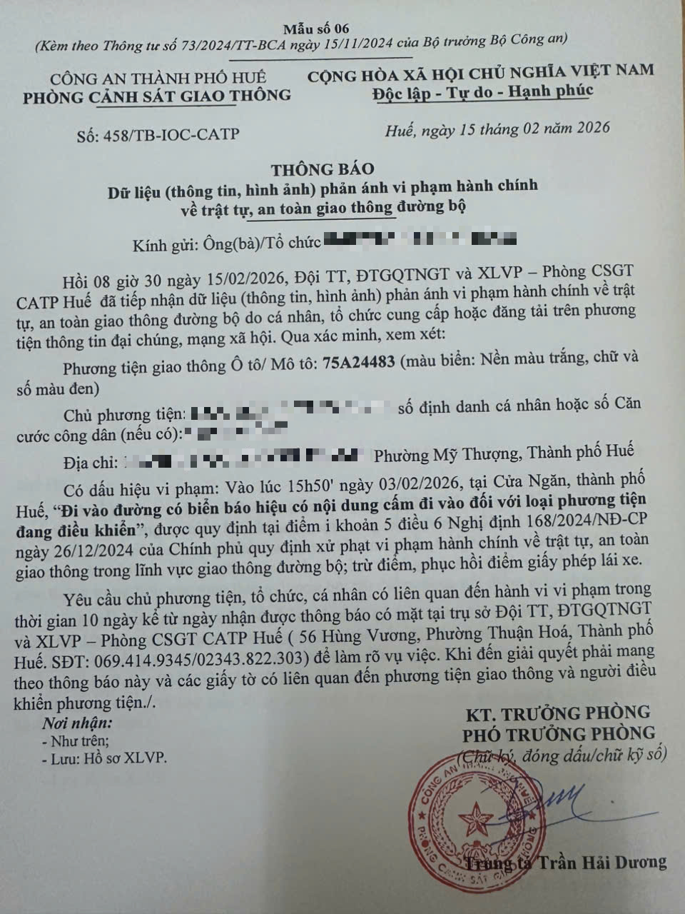 Qua hình ảnh phản ánh, Phòng Cảnh sát giao thông xác định lỗi vi phạm của người điều khiển phương tiện 75A24483 như sau: Đi vào đường có biển báo hiệu có nội dung cấm đi vào đối với loại phương tiện đang điều khiển, được quy định tại Điểm i khoản 5 Điều 6 Nghị định số 168/2024/NĐ-CP ngày 26/12/2024 của Chính phủ.