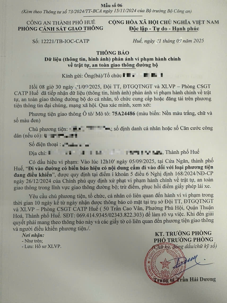 Qua hình ảnh phản ánh, người điều khiển phương tiện BKS 75A24486 có dấu hiệu vi phạm lỗi: Đi vào đường có biển báo hiệu có nội dung cấm đi vào đối với loại phương tiện đang điều khiển, quy định tại điểm i, khoản 5, điều 6 Nghị định số 168/2024/NĐ-CP ngày 26/12/2024 của Chính phủ quy định xử phạt vi phạm hành chính về trật tự, an toàn giao thông trong lĩnh vực giao thông đường bộ; trừ điểm, phục hồi điểm giấy phép lái xe.